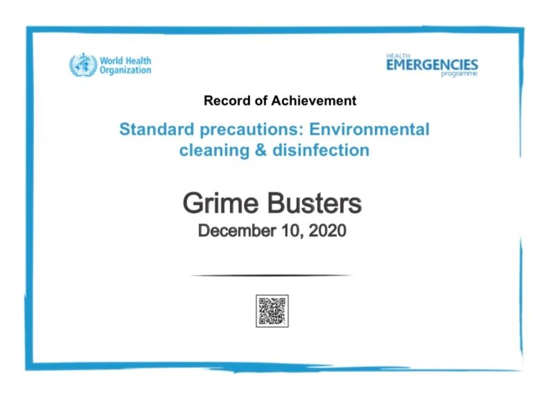 At Grime Busters we know this is a difficult situation and we want you to know that we are dedicated to keeping your family and business safe and healthy. We made sure to take a certification course through WHO in the proper cleaning and disinfecting of high touch surfaces as well as the proper disinfectants to use.